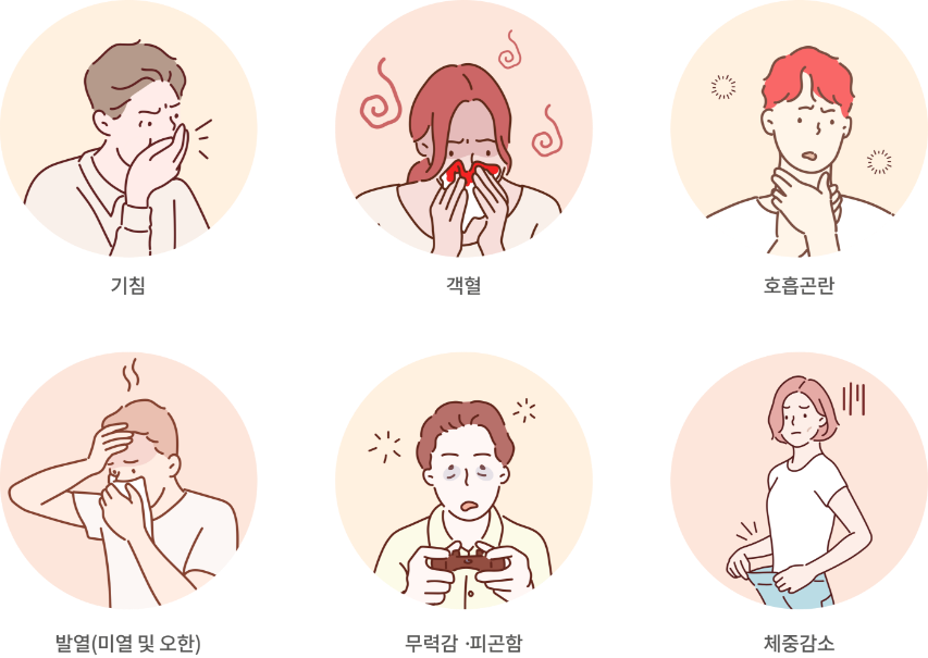 👉 증상: 2주 이상 기침, 발열, 체중감소, 피 섞인 가래, 피로