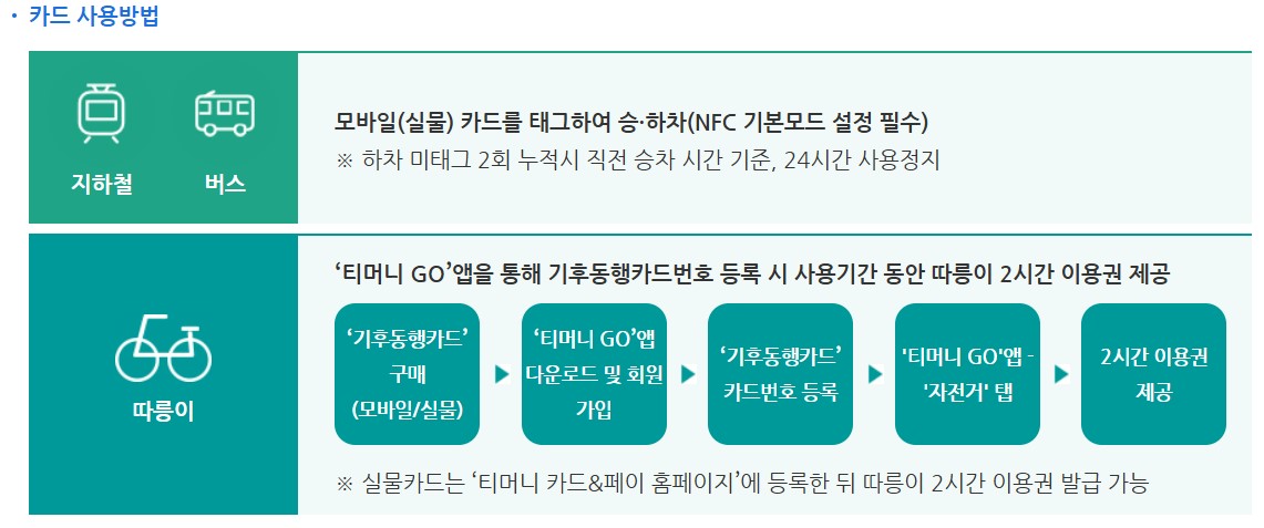 - 기후동행카드: '서울교통공사 앱' 또는 '우리 카드'에서 신청