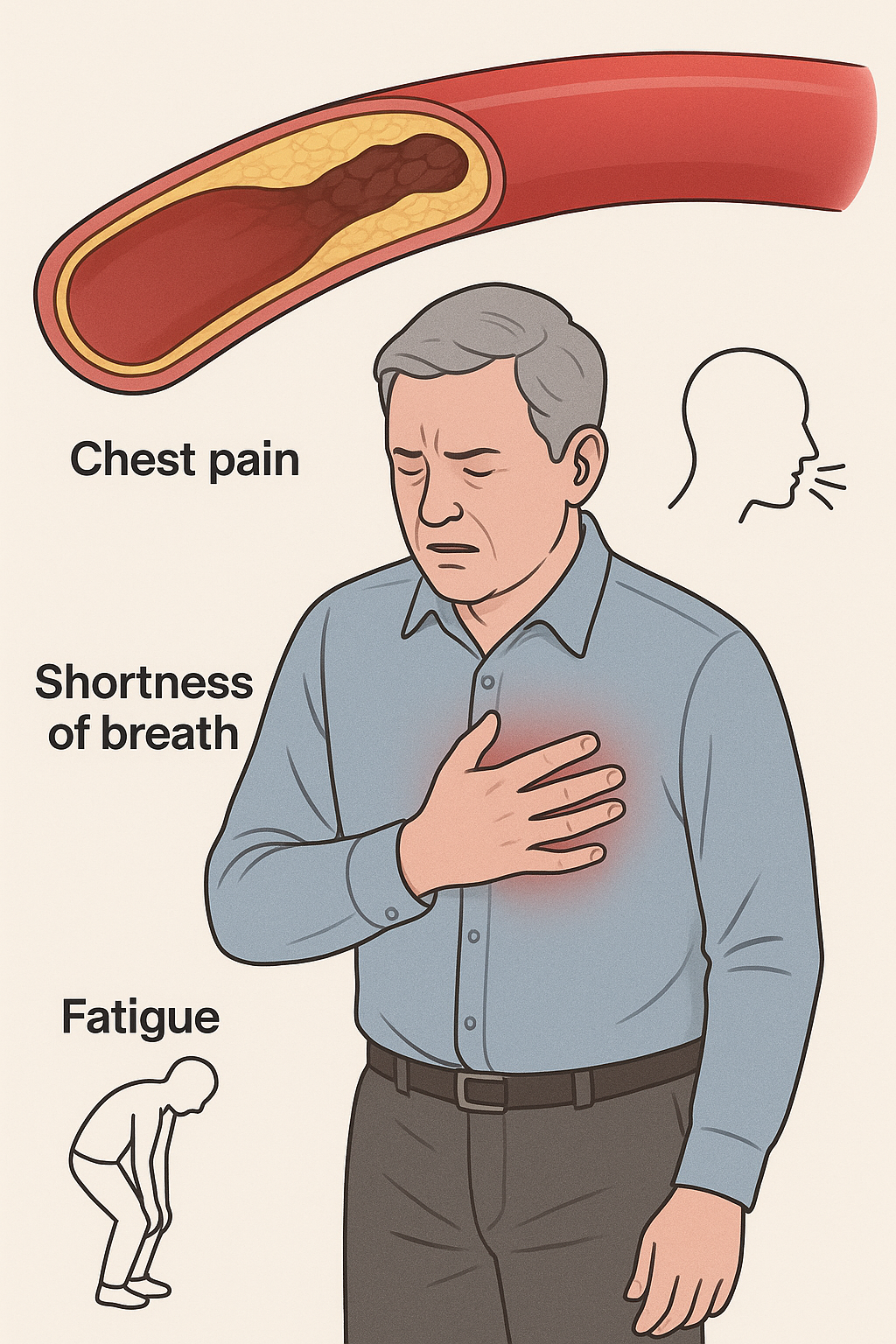 - 심장 동맥이 좁아질 경우: 가슴 압박감, 협심증, 운동 시 숨참