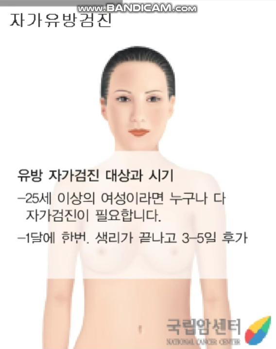 - 한 달에 한 번 유방 자가검진을 해보세요.