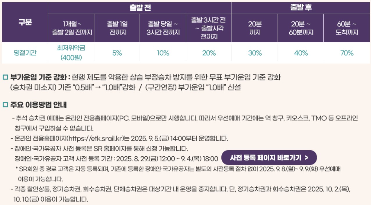 2025년부터 명절 환불 위약금이 강화돼서 출발 하루 전에는 요금의 5%, 당일엔 최대 30%까지 위약금이 붙습니다.