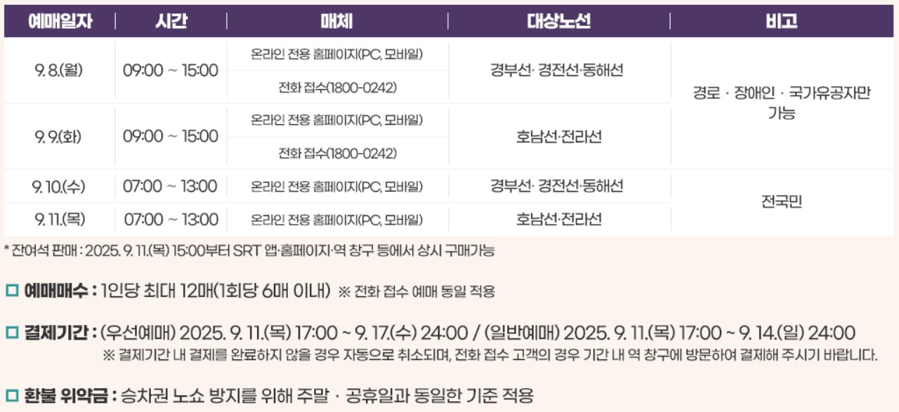 경로. 장애인. 국가유공자 9.8(월)~9.9(화) 예매 가능하며, 9.10(수)~9.11(목)은 전 국민 예매가 진행됩니다.