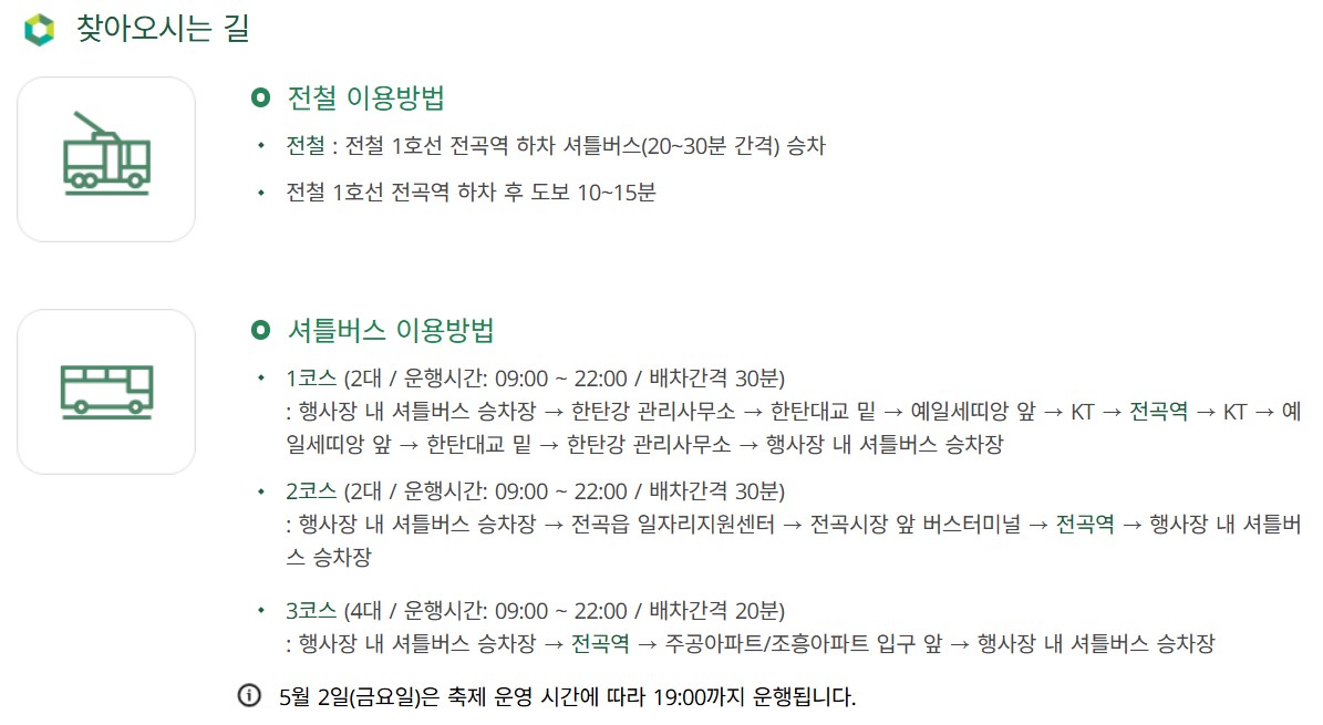 | 셔틀버스 | 전곡역 ↔ 축제장 무료 운행 (9:00~22:00) |